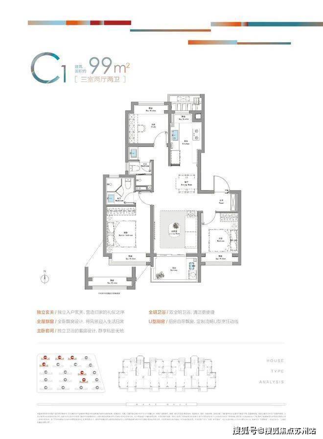 建面约99㎡C1户型则是典型的三开间朝南飞机户型,整个套内几乎没有走道,拒绝空间浪费,让业主有更加出色的居住尺度感。