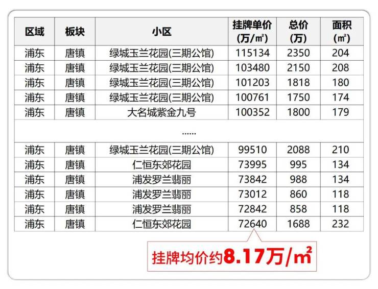 就像唐镇,区域内房龄近十年、设计标准已然定格于过去的改善型二手房,挂牌均价时至今日依旧牢固地站在 约8.17万/㎡。