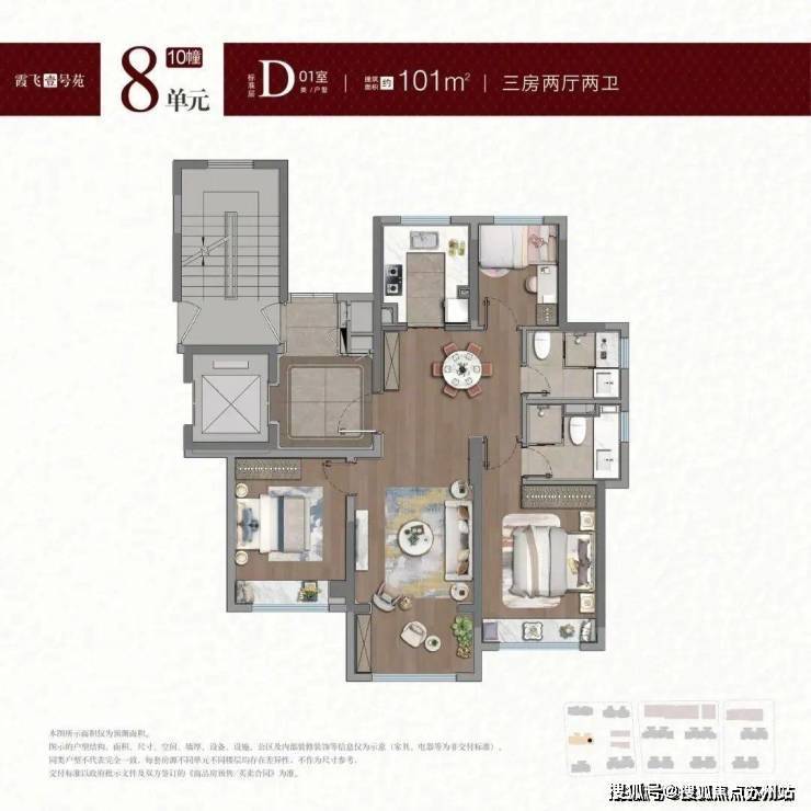 建面约100-101㎡户型, 拥类独立电梯厅,无连廊+飞机户型南北通透。