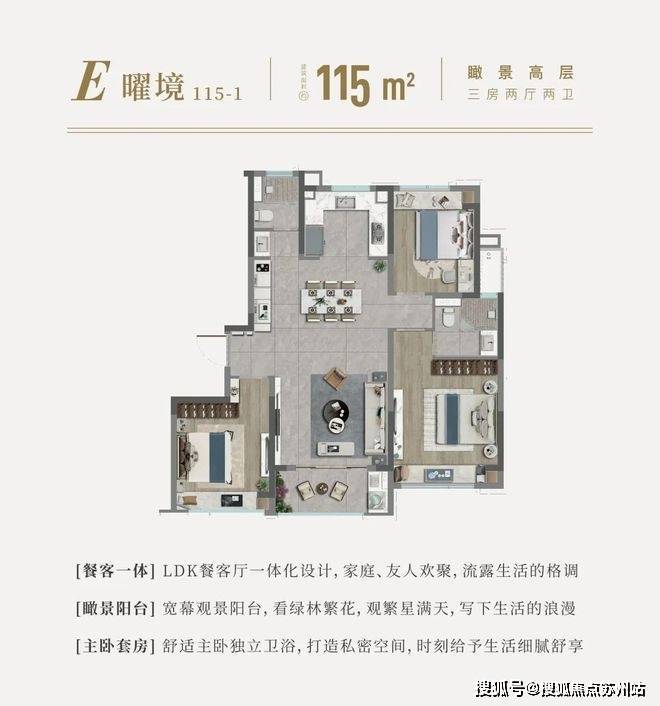 约115㎡3房2厅2卫,典型的“飞机户型”,同样餐客厅一体化,更宽敞的空间感;U型厨房,切配更流畅;卧室全飘窗,延展室内空间的同时,功能性更强;主卧套房设计,更私密、更舒适。