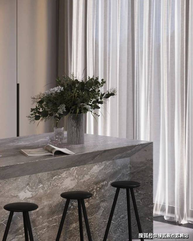 餐厅与厨房位于客厅的旁边,开放式的设计很好地利用了不大的公共空间,给人开阔的视觉感受.光线透过落地窗照入室内,让空间更加明亮.木质的圆形餐桌搭配上上方的金属吊灯,显得柔和而有质感.中岛台选用灰色大理石材质,与整体空间完美融合.