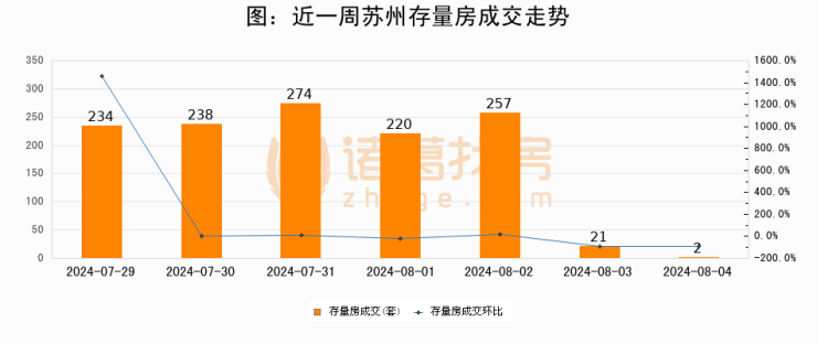 从存量房来看,2024年08月04日苏州存量房单日成交2套,比昨日减少19套,环比下降90.5%。从近一周存量房成交来看,苏州存量房日均成交套数为178套,08月04日单日成交2套,低于近一周平均水平98.9%。