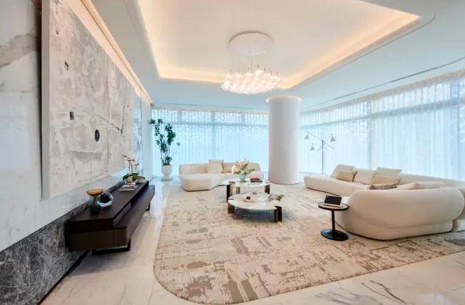 F+P的顶级豪宅设计经验与顶级酒店设计王者HBA的奢华体验,碰撞出全新灵感,尽呈登峰造极的顶豪E户型样板间。眼前尽是壮阔景象,客、餐、厨一体设计,呈现比排球场还大的无界奢厅,大气卓越。它以大岛台为枢纽,营造硅谷精英式的社交生活,也尽可满足名流酒会、家族宴会,亦或是董事会议的临时场所。
