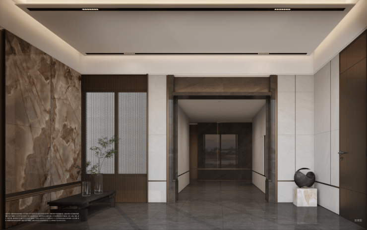 公区之奢:地上地下均配备了精装双大堂,运用定制奢石、岩板、金属等材质精心装饰,出入之间,尊崇感时刻相伴。