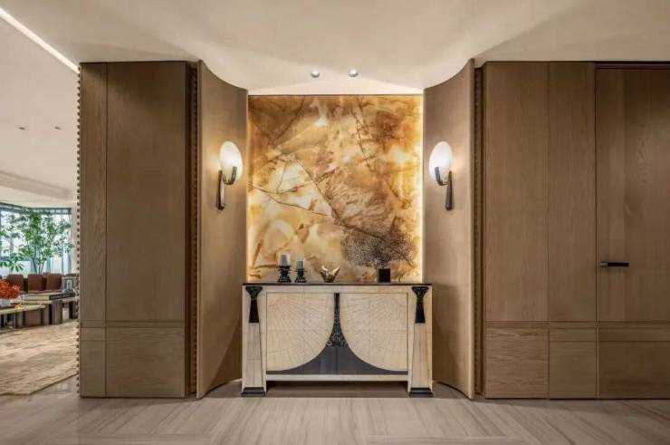在星级酒店式的单元大堂,铝板飞檐如裁云作玉璜。大门两侧的碎切维多利亚绿奢石纹理独特,如翡翠冻层叠湖底;搭配透光云石背景墙,又似春湖冰层初破时漫溢的潋滟,将“水琢玉成”的哲思凝为具象艺术。