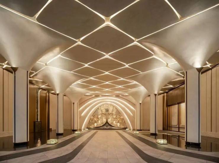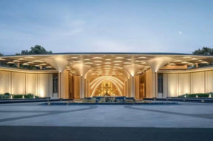 八方立柱撑起玉兰花瓣裂解穹顶。采用的是UHPC材料,卢浮宫同款,成本是普通石材的3倍,更是高级感的代名词。当你抬头,试图透过大门的穹顶寻找当晚的月色,你就浑然成为那个在满地六便士上抬头望月的人。