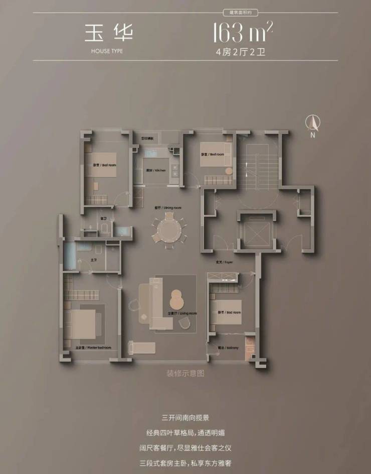 以建面约186㎡四房两厅三卫户型设计,朝南开间14.9米,客厅与卧室双联阳台设计约8米,采光优越,三卧朝南设计,南向双套房设计,南次卧外接封闭阳台。