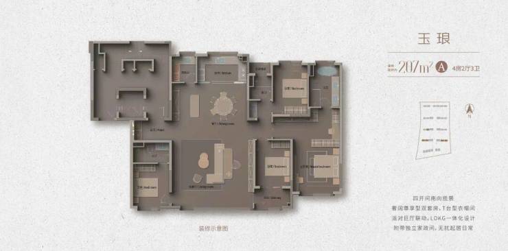 建面约207㎡,共有两种户型,但其户型整体设计思路基本相同。