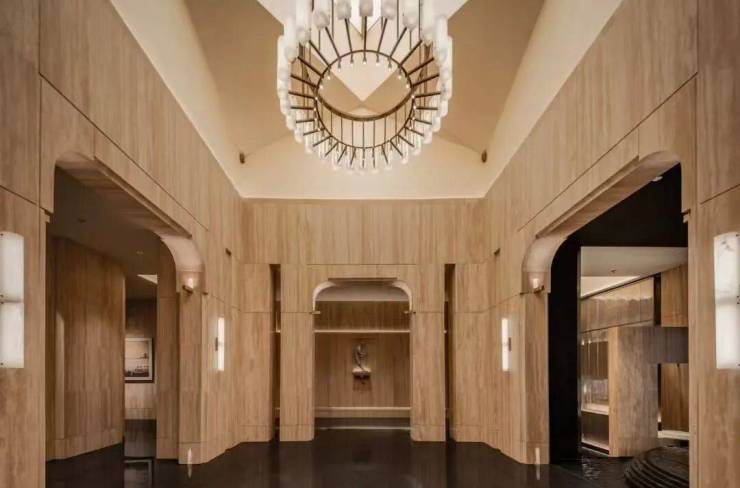 坡道采用柱廊阵列造型,以现代手法诠释古典美学。阵列间穿插铺设透光云石,搭配智能化灯光控制原则,灯光车行随亮,打造出集古典美学、智能科技与艺术光影于一体的美学空间。门楣处以奢石点缀,营造出星级酒店般的豪华感。入门有“迎宾毯”光厅引导,车马厅以腕表解构布局搭配掐丝珐琅地面,每个细节都彰显奢华。