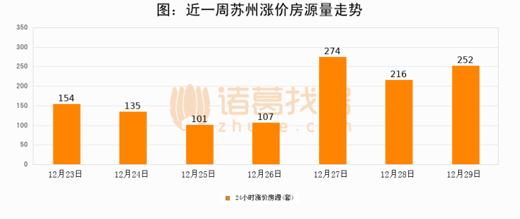 根据诸葛找房数据显示,苏州24小时涨价房源量为252套,较12月28日增加36套,环比上涨16.7%。与此同时,涨价房源占比小幅扩大,业主信心有所提升。