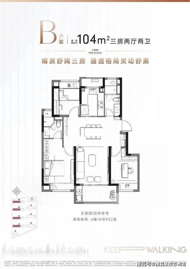 104m²户型:整体做到了真正的南北通透,三房户型的舒适度和阔绰感显露无疑。同面宽、同进深,使餐厅真正的独立存在,放下一张圆桌也绰绰有余。客厅、厨房、餐厅三大功能区以开放的方式连通,将生活的点点滴滴在此尽情演绎。