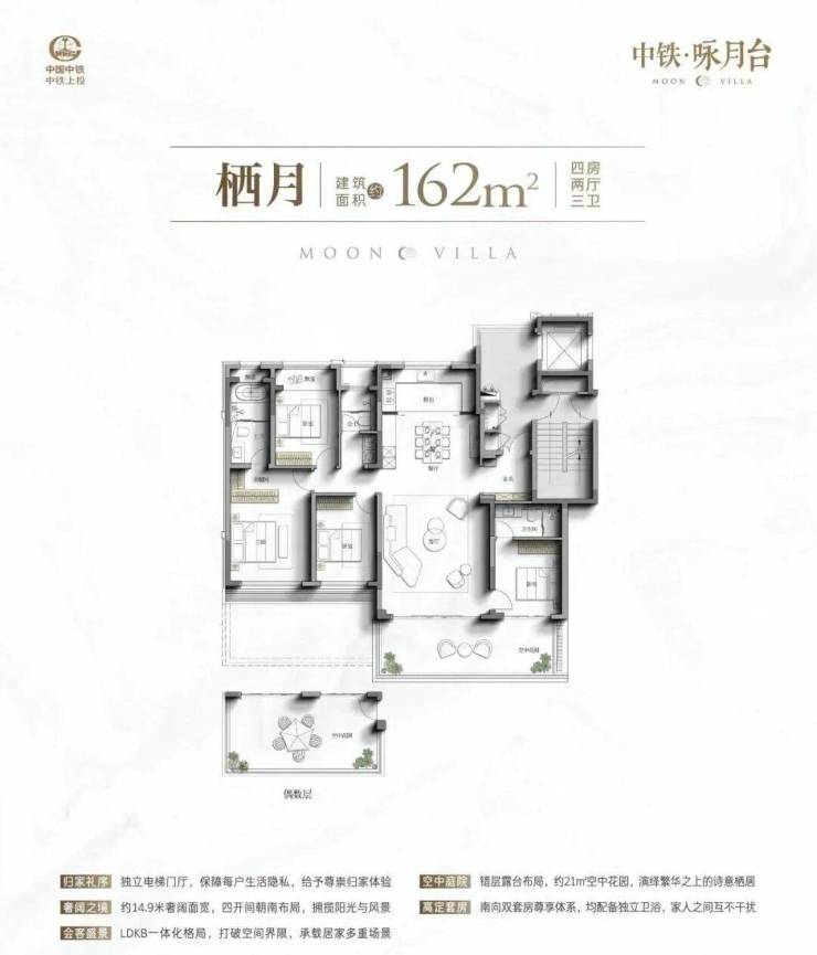 四代洋房(162-164㎡):拥有令人惊叹的空中庭院!偶数层私密花园连通主卧,奇数层社交花园衔接客厅。南向面宽达16.65米,搭配LDKB一体化横厅和双套房设计,得房率高达85%,生活尺度全面升级。这种创新的四代宅设计,重新定义了苏州洋房的居住标准。