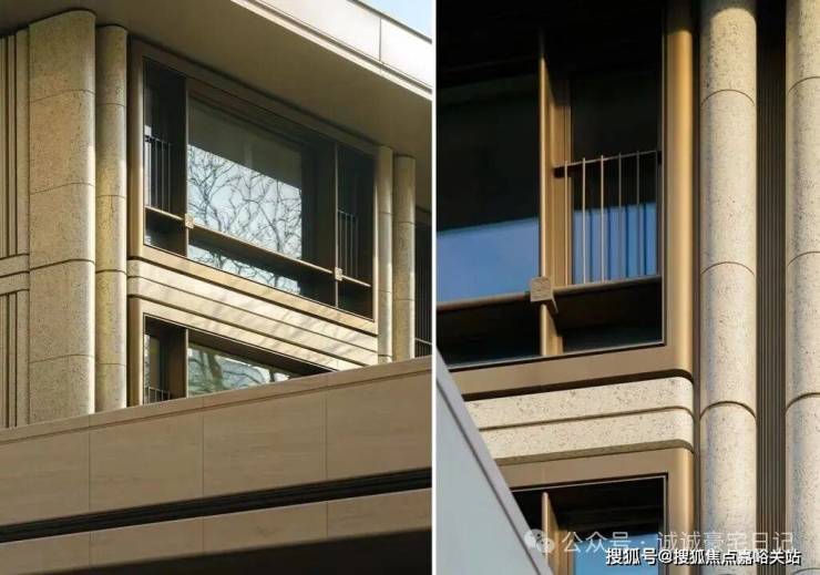 比如,立面采用米黄色石材,仿古铜色的金属线条,再配合大面积玻璃的通透视感,超高的窗墙比,高级感不言而喻。弧形元素在外立面上大量运用,使建筑呈现出柔和而不失庄重的美感。
