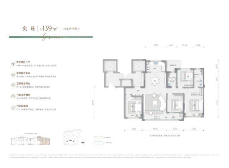 建面约139㎡四房两卫户型:堪称改善家庭的终极选择:独立梯厅入户,类一梯一户设计,尊享私密与静谧四开间朝南;约14米奢阔面宽,阳光满室铺展;餐客一体宽境,约7米阔绰开间,满足大家庭聚会需求;南面双联阳台,瞰景晾晒两全,兼具生活与诗意。