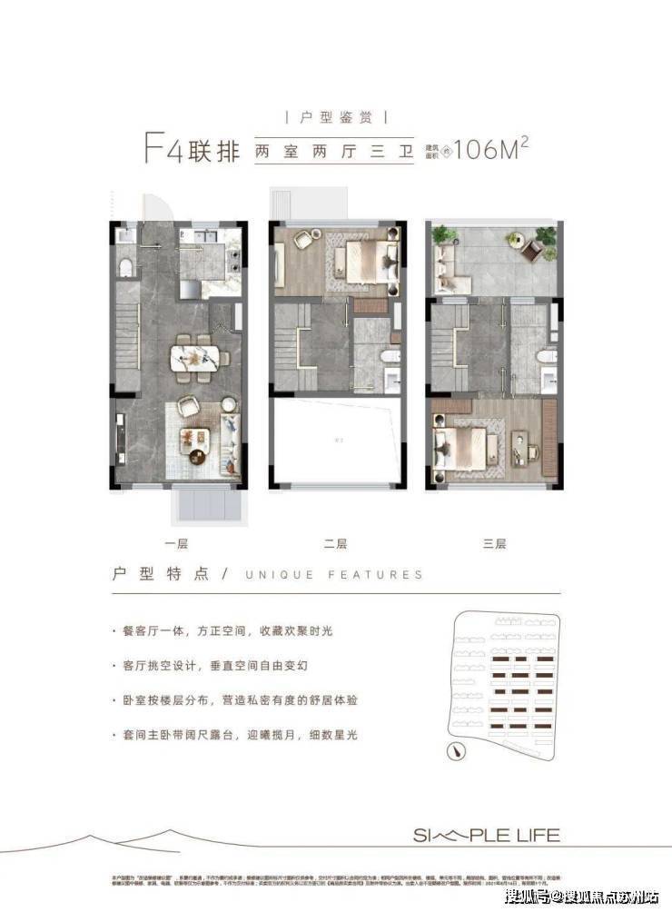 项目合计47幢楼,其中洋房12幢554套,联排33幢301套,项目整体分两批次推出,总计855套。采用人车分流,即保证社区整体设计的美观,又保证业主的安全性,车位有920个,做到1:1的比例。