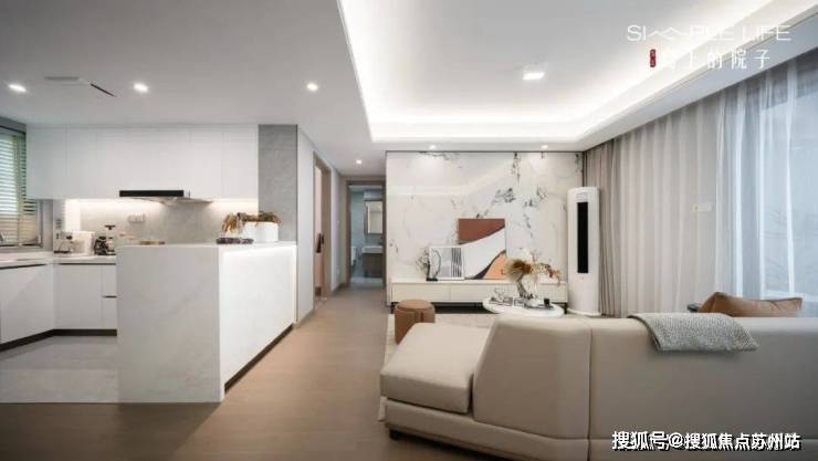 厨房是L型布局,有意思的是在侧边做了一个岛台,这个设计在约75㎡的户型中非常少见。