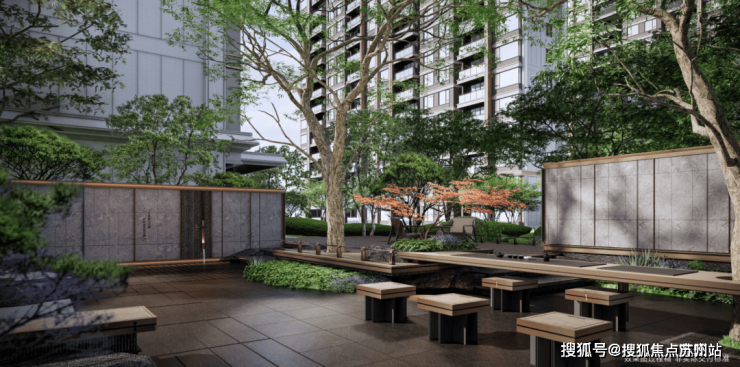 雅致石院与中庭古树相映,植物组团错落有致,营造出清逸山水园林之美,唤醒人们对林荫树下休憩闲聚的场地记忆.