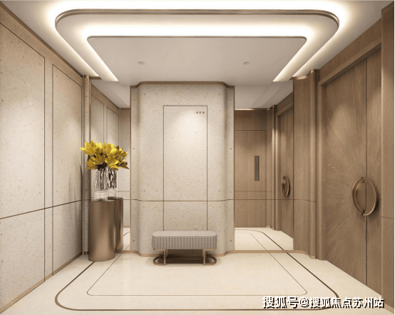 381户型公区电梯厅以独特的弧形墙设计引人注目,流畅的线条从吊顶自然延伸至墙面,精心雕琢的弧线不仅赋予了空间视觉上的灵动与层次感,在简洁与现代之间,营造出温馨而富有质感的归家氛围。