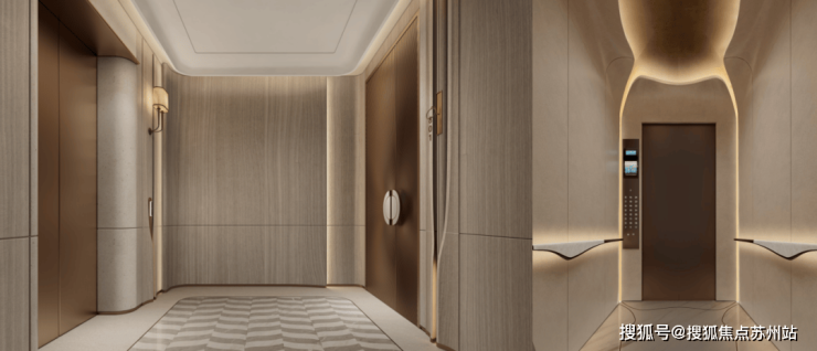 覆膜蜂窝铝板与局部石材饰面的巧妙搭配,285户型电梯厅以精致的材质肌理,演绎现代奢华的质感。