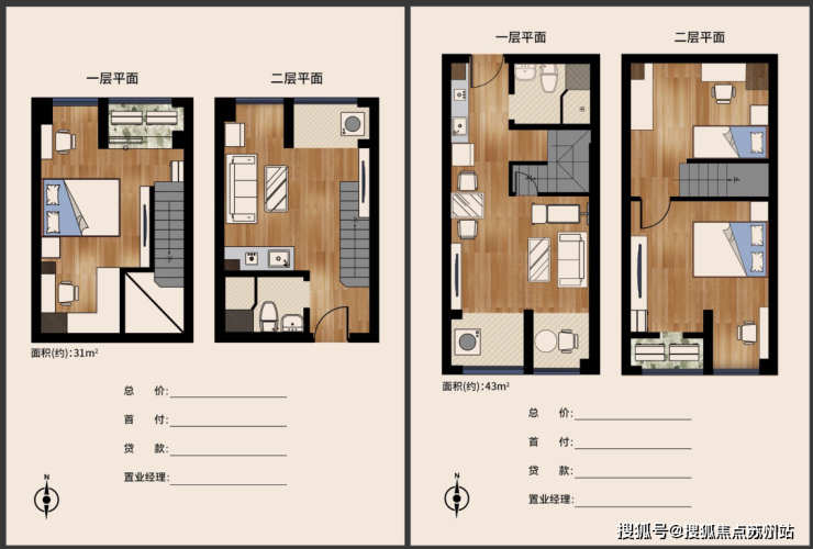 面积:朝南2房约43平,朝北1房约31平;