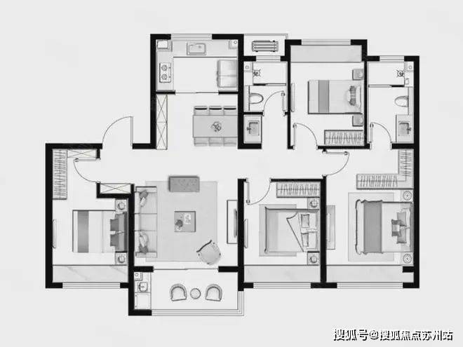 建面约128平米户型和建面约143平米户型,都是4房2厅2卫的配置,除了空间尺度有差异,户型布局几乎是一模一样。四个房间均朝南布置,确保充足的阳光和良好的通风条件。