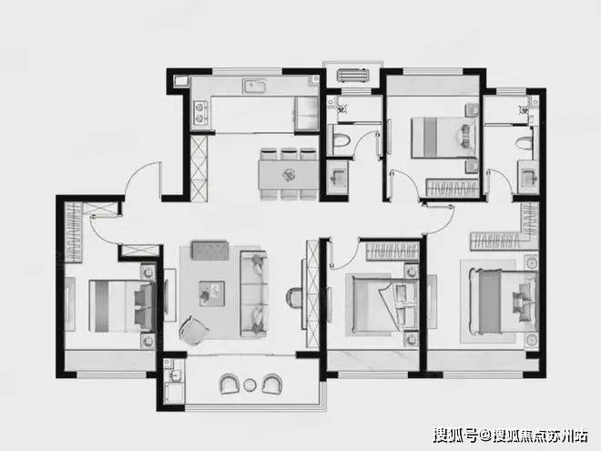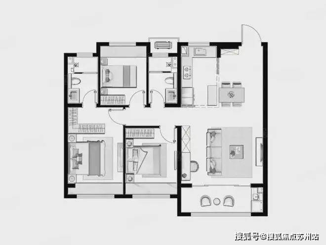 建面约112平米户型,注重实用与舒适的完美结合。采用大开间、短进深的布局设计,南向面宽达到约12米,客厅宽敞明亮,开间达4.8米,三个房间均朝南布置,空间开阔,采光充足, 既满足功能需求又确保居住舒适度。