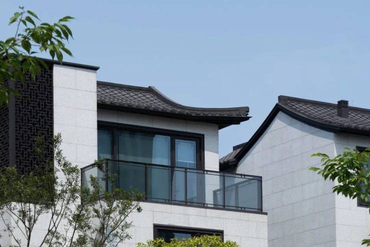 浅色石材的外立面上盖日式合瓦屋面,搭配深色金属构件,使得色彩构成冷暖有机结合,典雅简约,呈现出有时代气息的新中式建筑。歇山、硬山和小披檐等手法,丰富了建筑造型与建筑空间,与周围依山傍水的环境完美融合,组成了一幅幅画家笔下江南水乡静谧风雅的生活画卷。