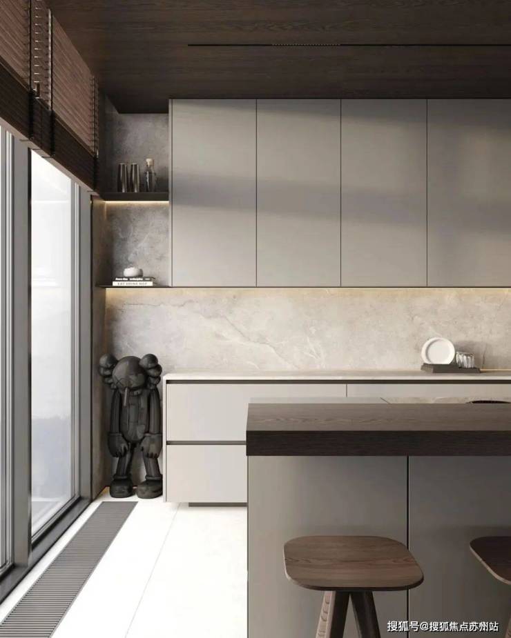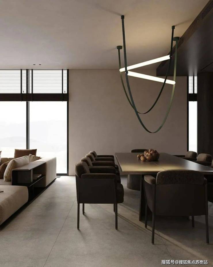 客厅中,蓝城丹枫云庐售楼处电话☎:400-882-8814(预约热线)✔✔✔设计师选用暖灰色作为空间的主色调,奠定整体沉稳的空间基调。灰白色的布艺沙发搭配上造型简洁的黑色大理石茶几,形成了色彩上的对比。大理石上细腻的纹理丰富了空间的细节,提升了整体的质感。大面的落地窗保证了室内拥有充足的光线,给人明亮的视觉感受。电视墙的设计十分简洁耐看。
