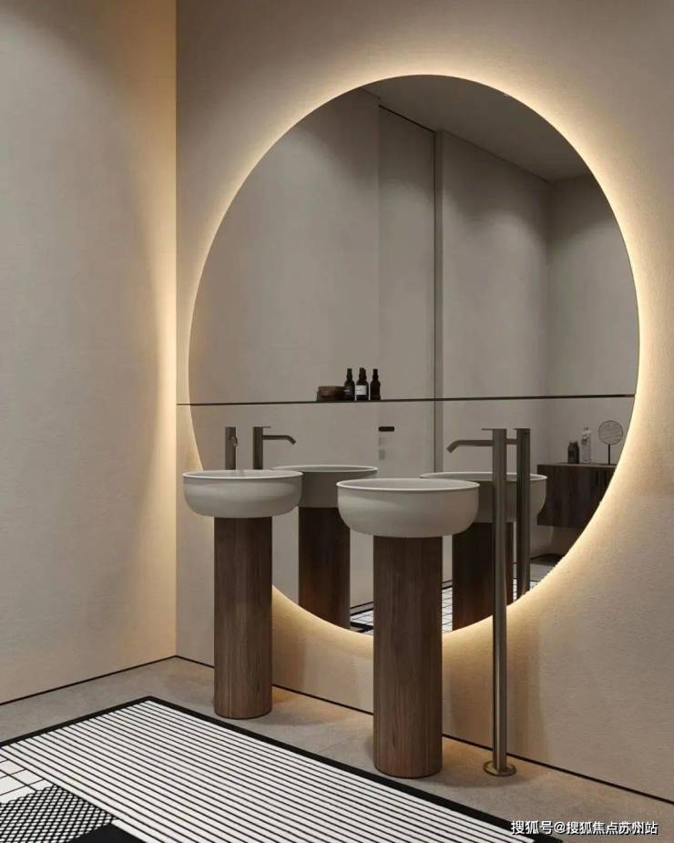 蓝城丹枫云庐售楼处电话☎:400-882-8814(预约热线)✔✔✔卫生间中,设计师选用灰白色作为空间的主色调,营造出一种舒适的轻盈感。圆形的镜面,让空间更显柔和与开阔。镜面背后的暖色灯光增添了空间的温馨质感。