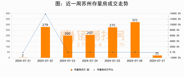 从存量房来看,2024年07月27日苏州存量房单日成交21套,比昨日减少300套,环比下降93.5%。从近一周存量房成交来看,苏州存量房日均成交套数为186套,07月27日单日成交21套,低于近一周平均水平88.7%。