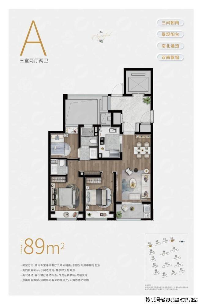 约98㎡3房2卫户型,三开间朝南,并且这贯穿客厅+次卧的超大阳台实在是惹眼,这个南向的视野延展度以及采光度相比同级别的户型来说,要更加出色。
