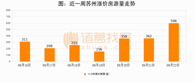 根据诸葛找房数据显示,苏州24小时涨价房源量为598套,较09月21日增加236套,环比上涨65.2%。与此同时,涨价房源占比小幅扩大,业主信心有所提升。