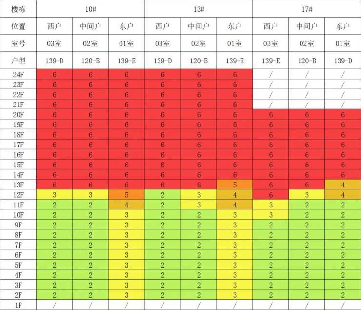 17号楼采光优异几乎不存在遮挡,10号楼低层受遮挡,13号楼中低层受遮挡。就具体遮挡时间而言,10号楼主要在傍晚受7号楼遮挡,13号楼主要在下午受14号楼遮挡。