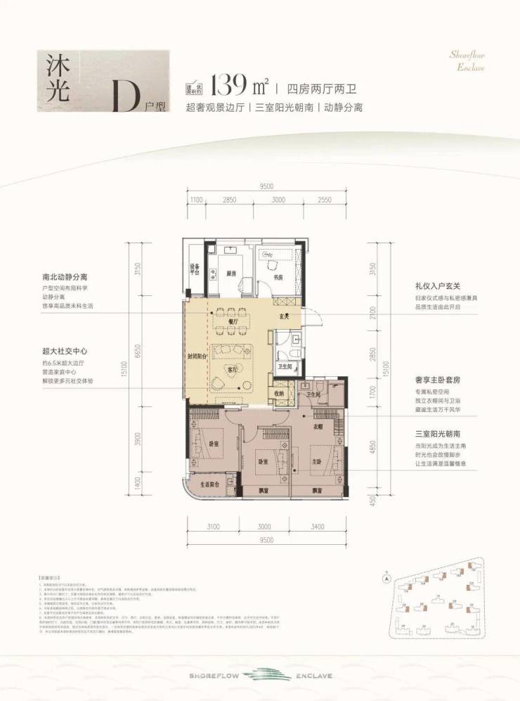 这款户型堪称四开间朝南的“流量王者”,南向面宽约13米,双联阳台+双飘窗设计,视野和采光优秀;套房主卧、双阳光次卧,颇有大平层的气势。