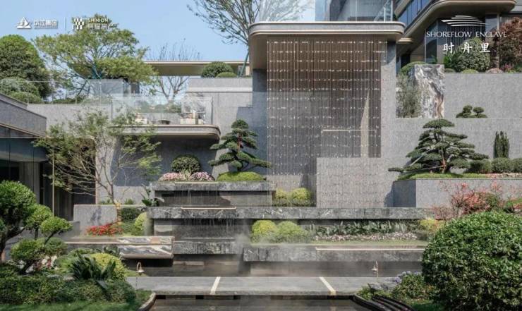其中 下沉水院作为关键归家场景之一,以水为引,叠瀑飞流,对景廊架,还有风景连廊,搭配波光粼粼的镜面水景和绿植点缀。