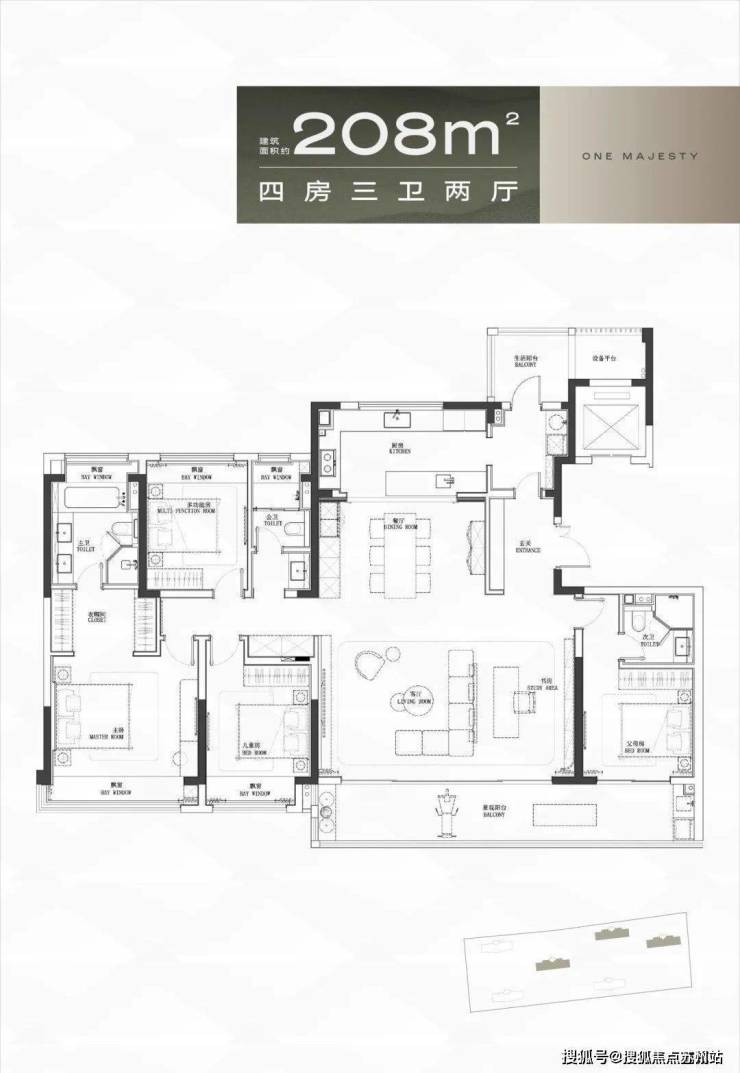 建面约208㎡,四房2厅3卫设计,南向双套房,而且主卧享有超大独立卫生间、可以放置浴缸和双台盆。