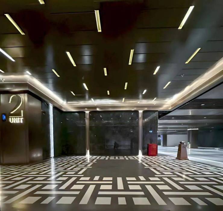In the core area of the underground garage of Gubei No.1 Mansion, an innovative space called the living room has been specially planned. The living room is located on the golden flow line between the main entrance of the garage and the elevator hall. As a transitional space for homeowners to drive from their seats to their homes, the floor showcases a unique artistic effect through unique mosaic craftsmanship and metal inlay. The ceiling adopts an invisible linear lighting system to create a warm yet luxurious atmosphere.