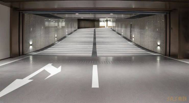 地面车道标线箭头与水磨石一体打磨成型,指引箭头外侧均包裹黄铜边框,虽工艺费时费力,但耐久性好、不易开裂、艺术感强,更显奢华。