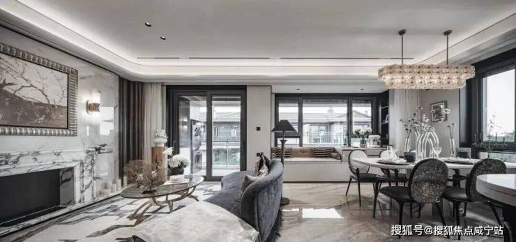 首先是奢石含量极高,从入户处的玲珑玉拼花与透光云石辉映,到翡翠绿奢石墙景、再到发光云石装饰点亮归家路,石材的典雅贯穿始终。