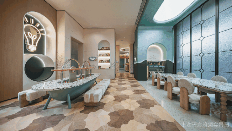 可爱的绿色小泰坦不远万里,为孩子们带来一场奇趣体验。设计师以孩子的视角,布局童梦天地,更低的桌椅、更柔软的材质、更温暖的画面,在有限的空间里回应童年无限的好奇与渴望。