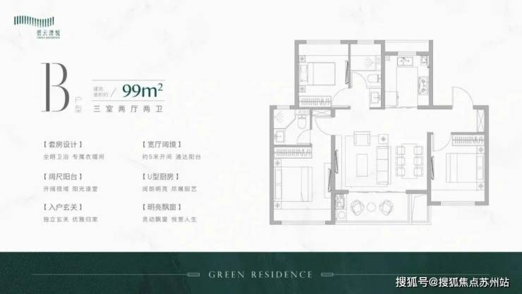 建面约99㎡B户型,1梯2户,层高约3.05米,精装交付,得房率约76-76.7%,总价约540-580万;