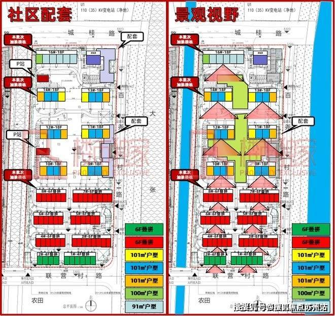 景观视野:景观资源分两方面:1.地块外部的河流景观;2.社区内部景观。其中社区内部景观主要集中在高层住宅楼之间,所在楼层越高,景观视野越好!这里需要注意16#楼的东边户,南向的景观轴线目测破百米哦!