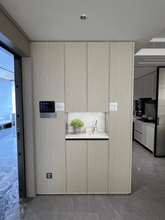 通顶玄关柜,内置鞋柜精灵,可以看到玄关内部的隔板也是高度不一,普通鞋子、高跟鞋、杂物等等,都有分区。