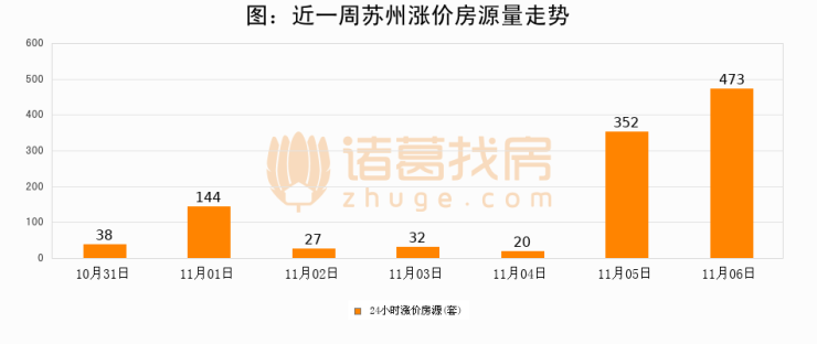 根据诸葛找房数据显示,苏州24小时涨价房源量为473套,较11月05日增加121套,环比上涨34.4%。与此同时,涨价房源占比小幅扩大,业主信心有所提升。