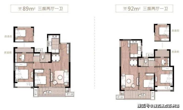 项目一共包含四种产品,分别为约89㎡、92㎡的三房一卫以及约105㎡、113㎡的三房两卫户型。
