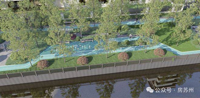 除了内部景观外,项目还借景古塘河,为业主打造约2600㎡水岸公园,含水杉树阵、绿地草坪、400米跑道及健身设施等。