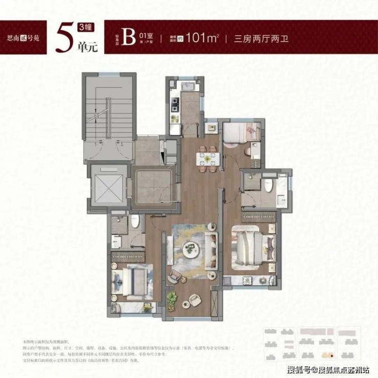 建面约100-101㎡户型, 拥类独立电梯厅,无连廊+飞机户型南北通透。