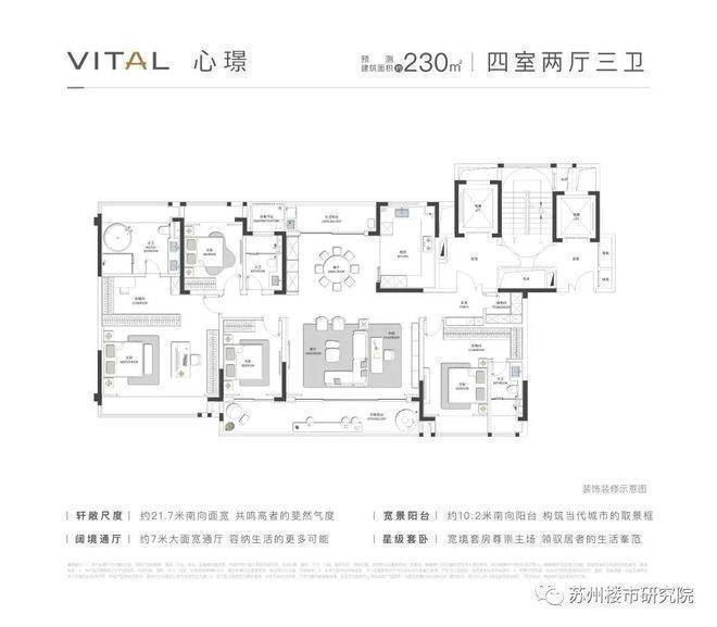 主力户型:约170㎡、197㎡、230㎡,均为四室两厅三卫.