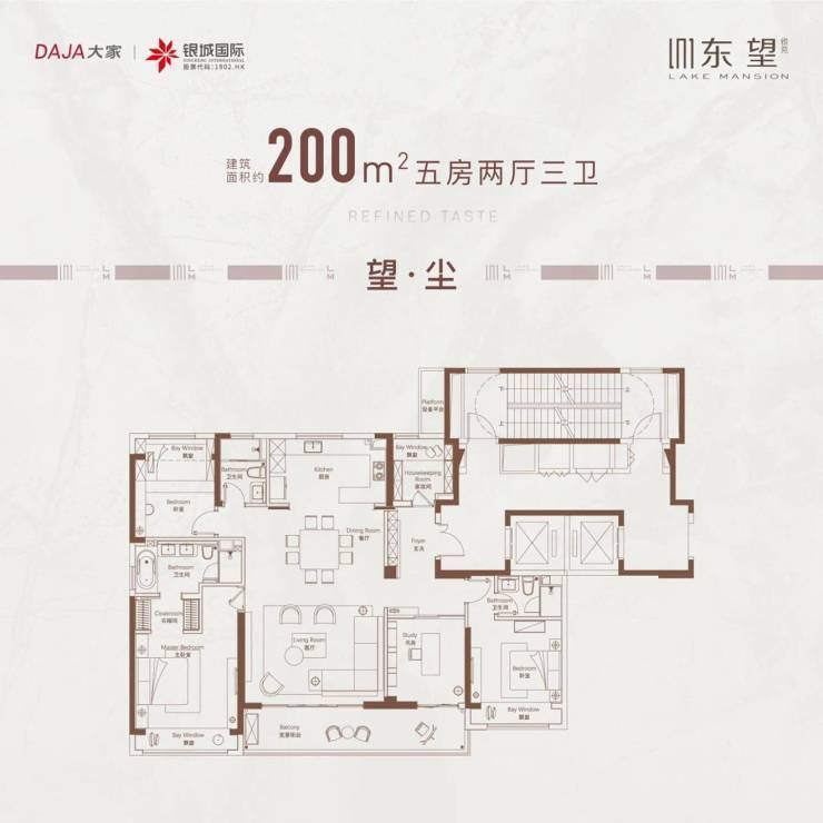 200㎡五房两厅三卫:四开间朝南,约8.8米南向双阳台,主次卧双套房设计,总价500-550万元