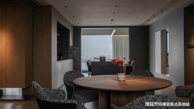 原木材质的圆桌,深色木纹与家中的暗黑色调相得益彰。每天傍晚坐在这里用餐时,还能有机会欣赏到客厅窗外“长河落日圆”的美景。